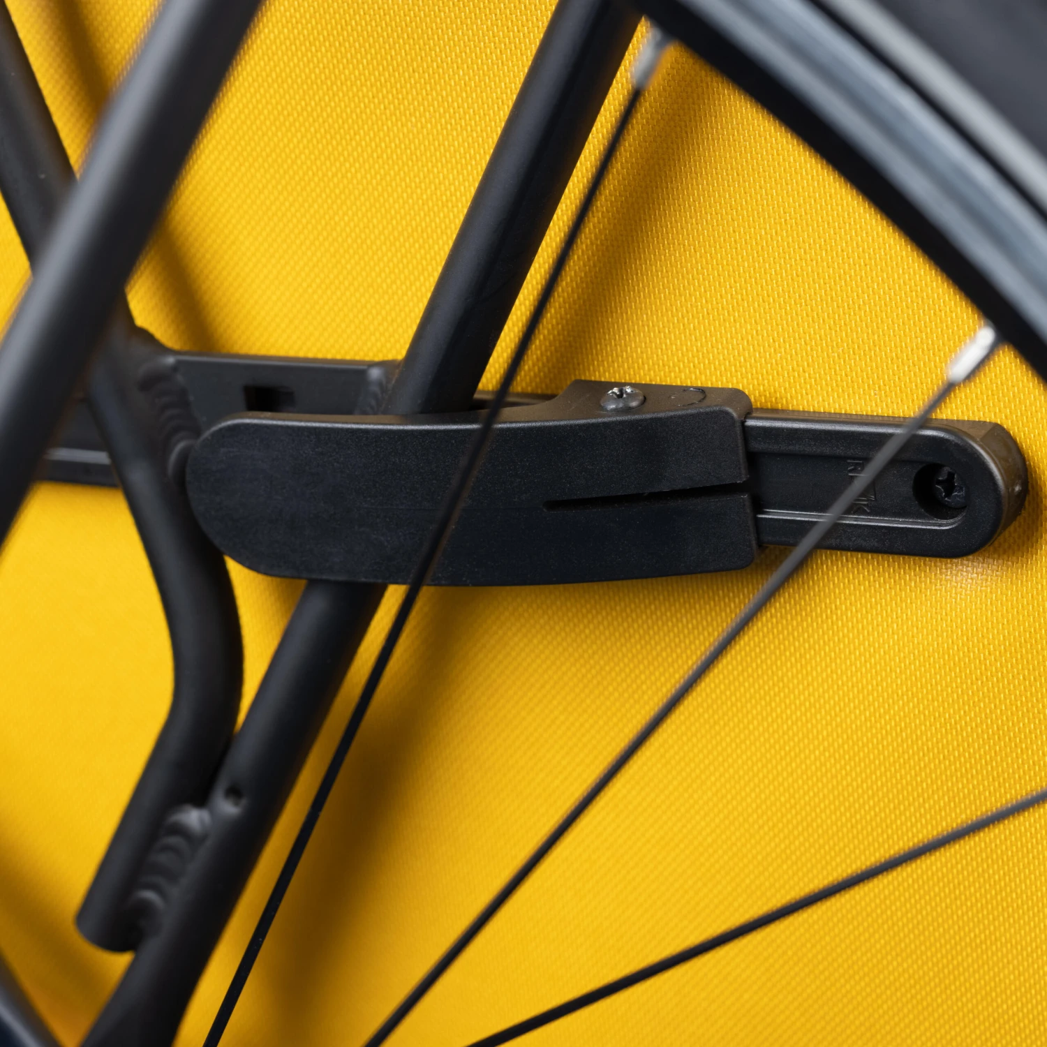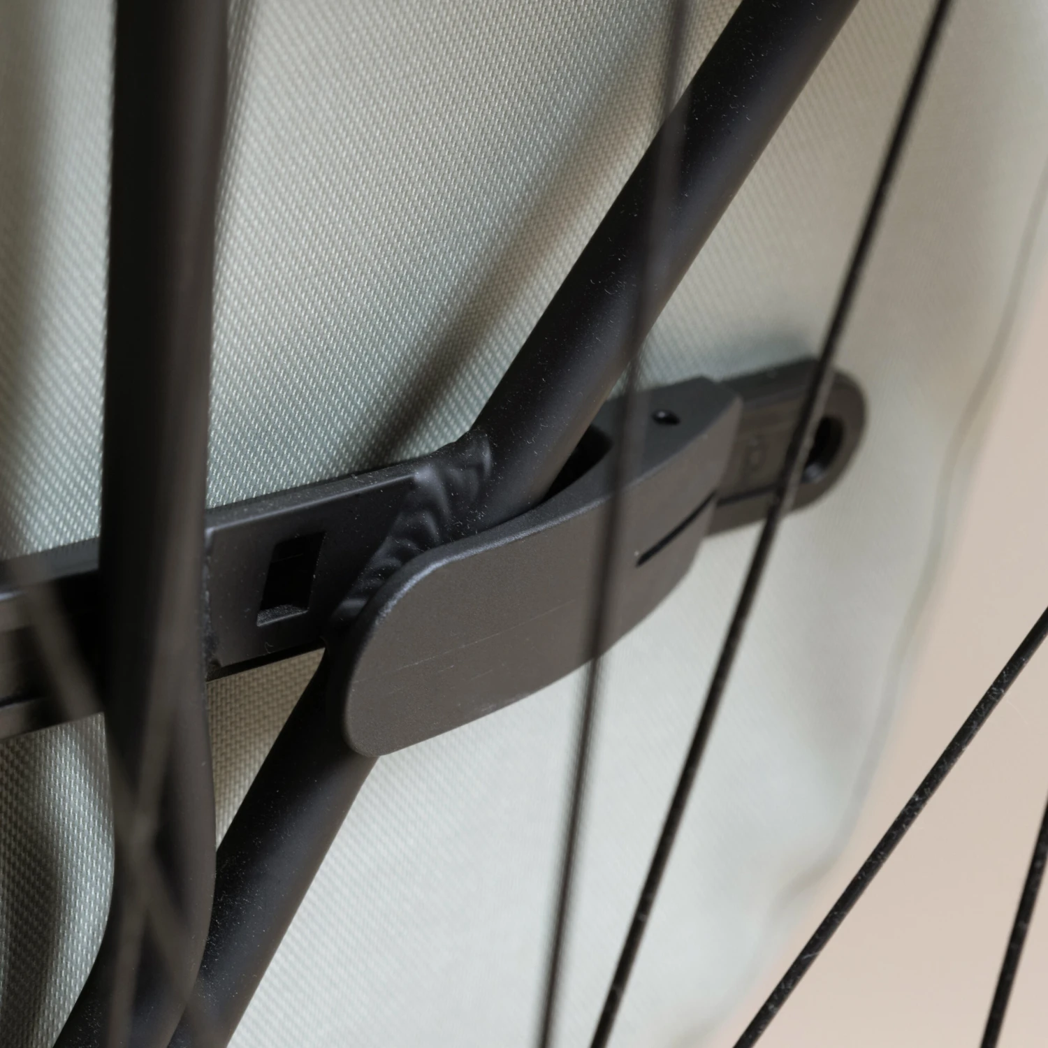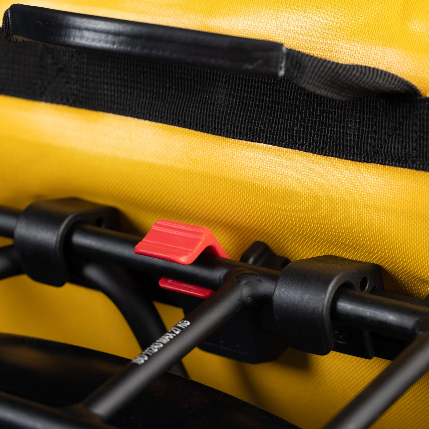 The adjustable lower attachment system on a rail allows the bag to be securely fastened to the pannier rack, thus improving its stability in the event of a bump or impact.
