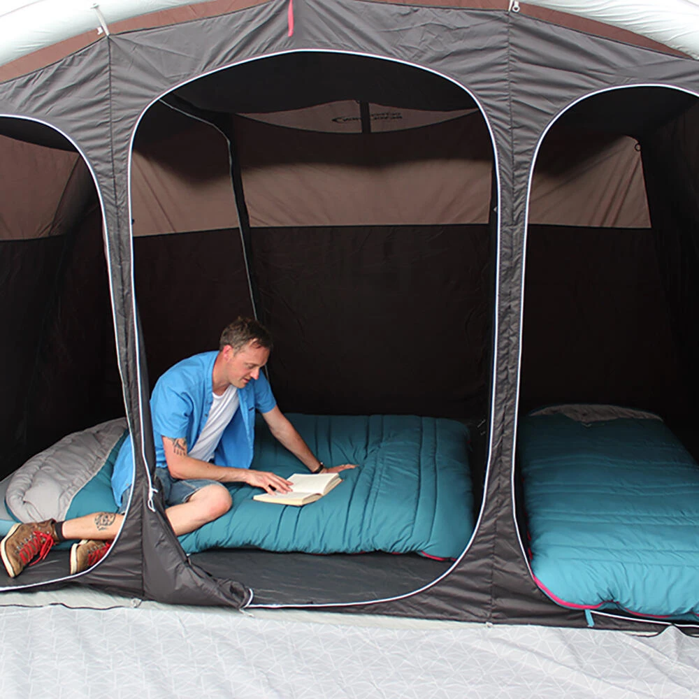 This premium inflatable 6-berth family tent has swiftly become a best-selling family favourite following its introduction in 2018 due to its perfectly sized footprint. The internal space of this 3-zonal tunnel tent is split between 3 flexible bedroom compartments, a great sized living area and a spacious front porch, which can be fully enclosed using the windowed front door. Updated features and benefits for 2022 include a double-width patio style side door with phoenix mesh ventilation adding to the already outstanding functionality of this tent. Including additional mesh ventilation fly screen panels and our vortex bedroom ventilation system, which aid in consistently maintaining pleasant airflow and reducing internal humidity in warmer. The darkened ‘Twilight’ bedroom pods create a comfortable sleeping environment, and a wealth of premium features including zip-up curtains, and a two-thirds roll-back central door makes this tent the choice for discerning family campers. • 240 HDE high density all weather lightweight fabric
