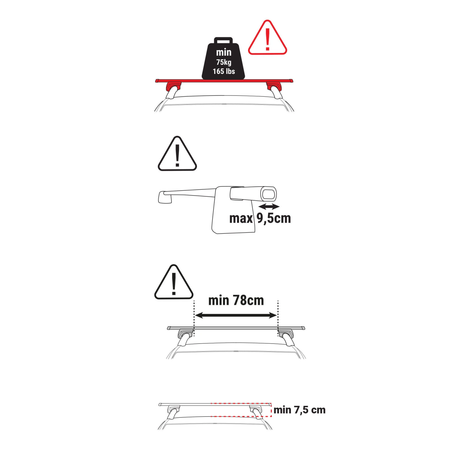 The usable width is 78 cm, the distance between the roof and the top of the roof bar must be greater than 7.5 cm and the width of the roof bar tube must be less than 9.5 cm (see the diagrams in the product sheet photos).