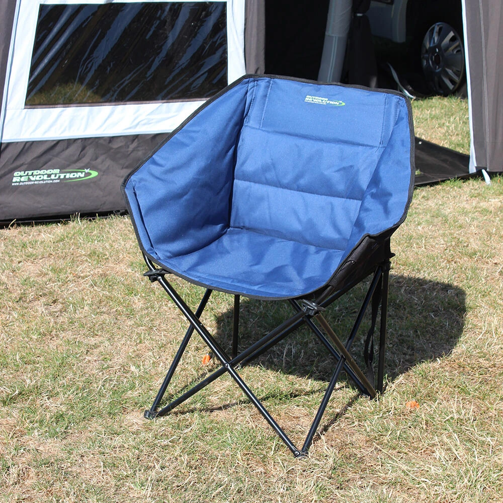 A compact folding camp chair with comfortable padded surround sides and supportive backrest. The padded fabric and sturdy steel frame provide exceptional comfort and support whilst the oversize wide base feet help to prevent the chair from sinking into soft ground and damaging ground sheets. Available in a choice of 3 complimenting colour variations. • Opens and folds in seconds